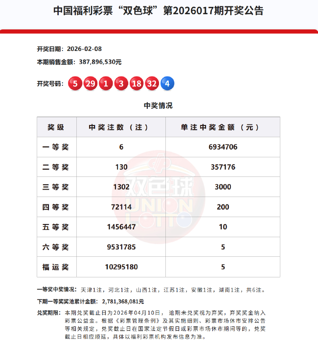 北京本事2026年2月8日,福彩双色球第26017期开奖,当期开奖号码为红球01 03 05 18 29 32,蓝球04。本期一等奖共开出6注,单注奖金693万余元。因开奖前奖池高于15亿,奉行相配章程,增设5元福运奖(掷中3枚红球即中奖),福运奖开出10295180注。